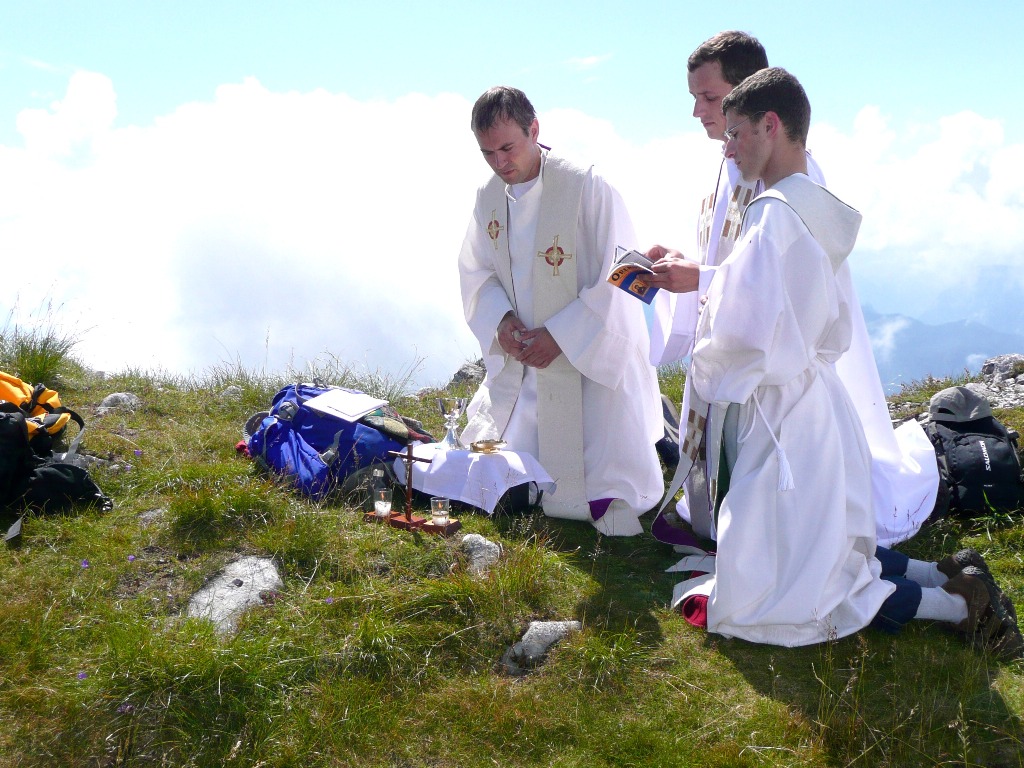 Po krótkim odpoczynku na szczycie misjonarz Artur Kalinowski odprawił mszę św. wraz z dwoma kapłanami z diecezji tarnowskiej. Msza św. w niezwykłej scenerii przepięknych szczytów alpejskich i wśród opadających chmur zrobiła na nas niesamowite wrażenie. Podziwiając przepiękne widoki ze szczytu, zrobiliśmy setki zdjęć.